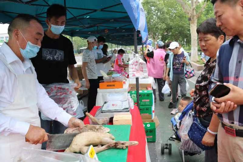 活动现场人来人往,非常热闹,大家在摊位间饶有兴趣地逛着、尝着、买着,由于展示的优质农产品既新鲜又便宜,现场人气和销售两旺。