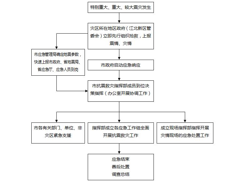 应对一般地震灾害,启动四级响应。灾区所在地区政府(江北新区管委会)成立抗震救灾指挥部,负责领导、指挥和协调抗震救灾工作。必要时成立市抗震救灾指挥部,根据灾区需求,协助做好地震应急工作。