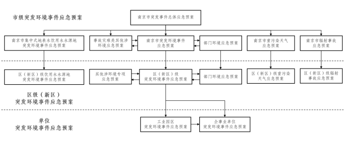南京市突发环境事件应急预案体系由市级突发环境事件应急预案、区(新区)级突发环境事件应急预案、单位突发环境事件应急预案等三个层级组成,具体情况见下图。