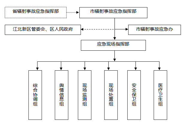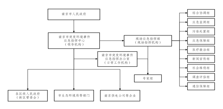 南京市突发环境事件应急组织指挥体系由领导机构、日常工作机构、现场指挥机构和专家组组成,具体情况见下图。各区(新区)突发环境事件应急组织指挥体系由各区级人民政府和南京江北新区管理委员会(以下简称“江北新区管委会”)确定。