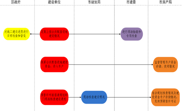 各区政府负责配套设施建设的日常管理,对本区范围内配套设施的布局、规划设计、施工、验收、移交等全过程监督,并受市建委委托,组织公共配套设施的联合查验工作。