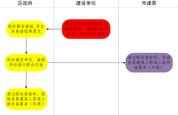 (5)对通过联合查验的项目,发放房屋建筑工程竣工验收备案表,组织建设单位、接收单位进行联合交接(需无偿移交的公共配套设施)。
