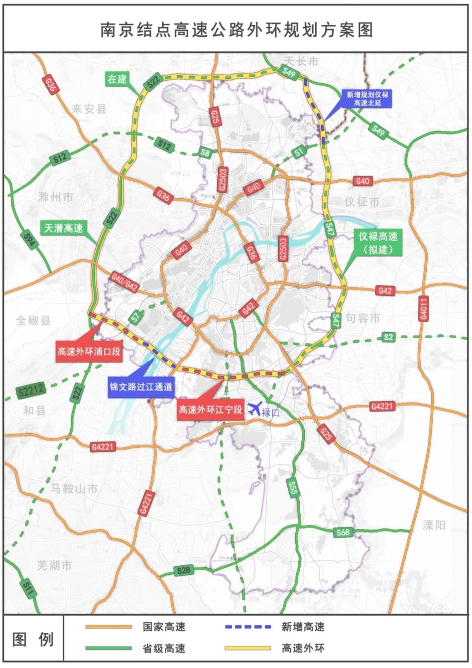 专栏2 交通基础设施建设重点工程 1.航空机场:推进禄口机场三期工程,推进高淳通用机场建设,推进六合马鞍机场民用功能前期研究。 2.铁路建设:推进宁淮铁路、南沿江铁路、沪渝蓉高速铁路、宁宣铁路、扬镇宁马铁路、宁芜铁路扩能改造工程等建设,力争开工建设宁滁蚌亳铁路、南京至杭州铁路二通道。开展七坝港区铁路专用线、铜井港区铁路专用线前期研究。 3.高速公路:续建宁合高速江苏段改扩建、宁马高速公路江苏段改扩建、高淳至宣城高速公路江苏段,推进南京至滁州高速公路江苏段、南京至盐城高速公路、都市圈环线高速公路禄口至全椒江苏段、仪征至禄口机场高速公路南段、龙潭过江通道南接线、南京至和县高速公路江苏段等建设,推进南京至广德高速公路江苏段、南京至黄山高速公路江苏段等前期工作。 |