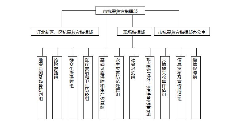 市地震应急组织指挥体系由市抗震救灾指挥部、现场抗震救灾指挥部和区(江北新区)抗震救灾指挥部等构成。有关部门和单位可根据需要设立地震应急工作机构,负责本部门、本系统地震应急工作,并服从当地抗震救灾指挥机构统一指挥。