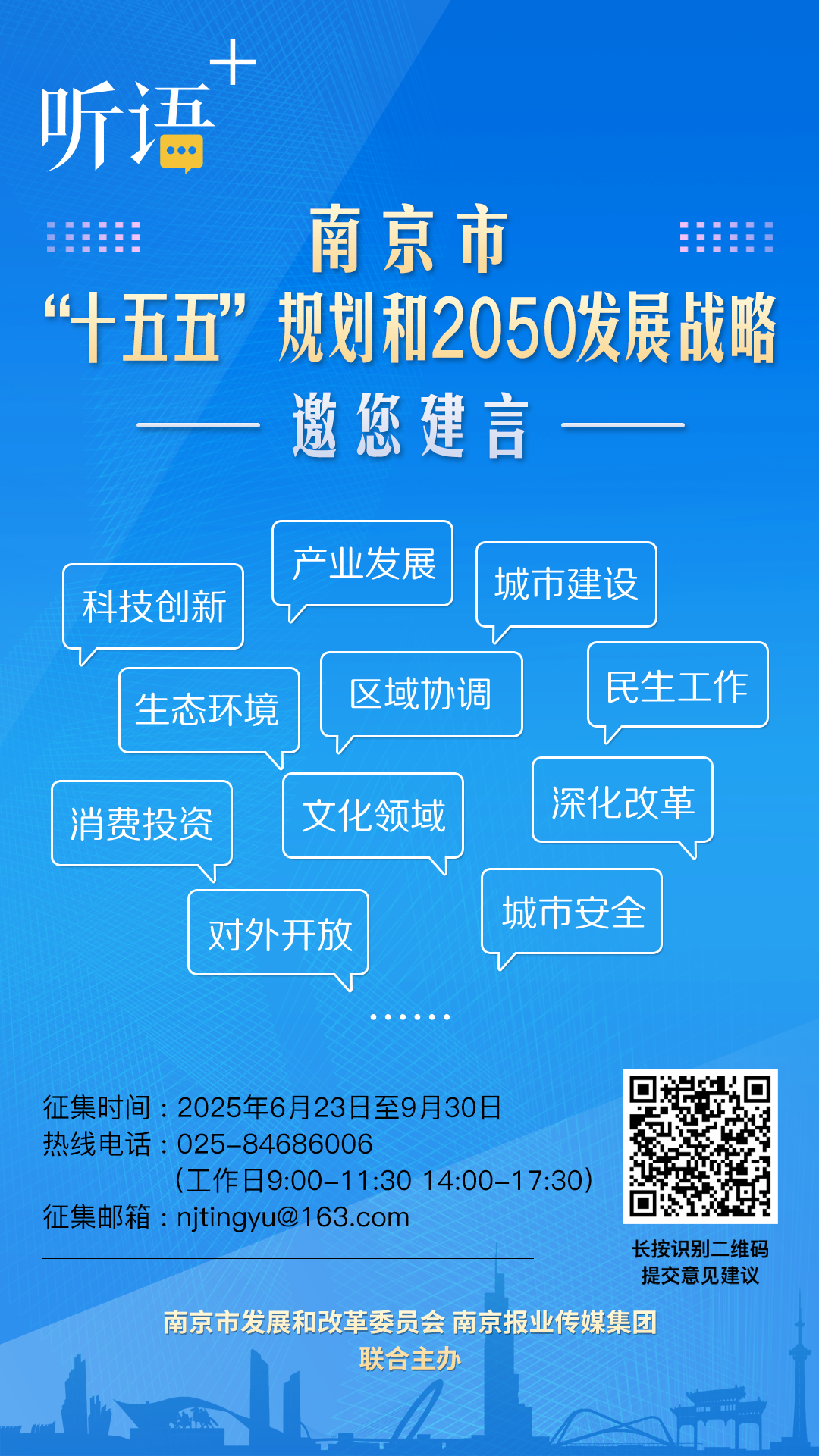 今年是“十四五”规划收官之年,也是“十五五”规划谋篇布局之年,同时,市委市政府正在开展面向2050年的南京城市发展战略研究,努力做到“一张蓝图绘到底”,为推动南京在中国式现代化新征程中“走在前、做示范”凝聚力量。为坚持科学决策、民主决策、依法决策,把顶层设计和问计于民统一起来,现通过“听语+”平台,面向广大市民朋友公开征集“十五五”时期(2026—2030年)和面向2050年的发展意见建议。