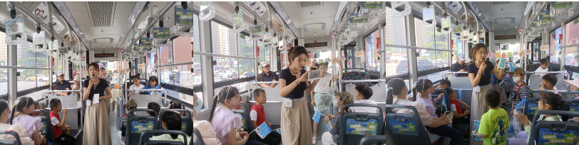 CityBus主题车里,多彩可爱的儿童节装饰物随处可见,充满童趣。来自南京江豚水生生物保护协会的郝旭玲老师在车厢里为孩子们带来了一堂趣味十足的生物科普课,一起学习长江江豚相关知识。郝老师拿着精美的长江江豚明信片为孩子们展示长江江豚的习性,并用通俗易懂的语言进行详细地介绍。深入浅出的科普让孩子们听得津津有味,他们积极参与互动,收获满满。最后,郝老师还跟孩子们分享了她前不久参与救助小江豚的经历,期待大家积极参与到保护环境、保护生态的行动中。
