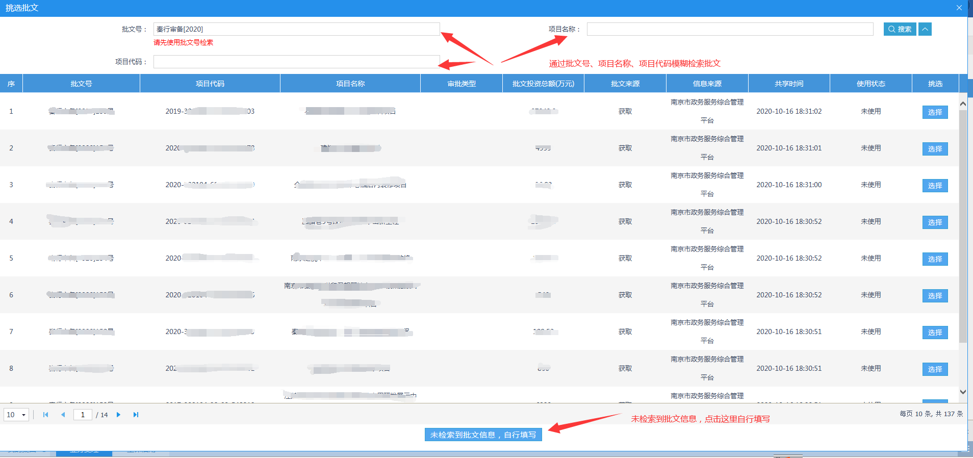 目前与水利、交通行业项目审批文件对接尚在开发中,若未检索到批文信息,请点击页面下方‘未检索到批文信息、自行填写’。