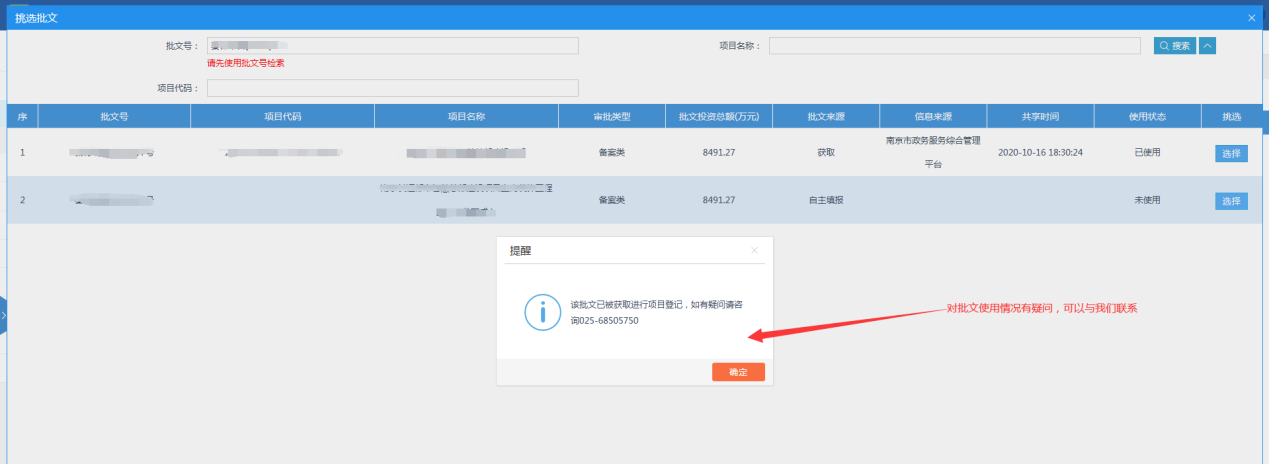 批文检索时出现信息来源为“获取”、“自主填报”两条数据时,请挑选使用状态为“已使用”的批文信息,若无法挑选批文或者对批文使用情况有异议,您可拨打025-68505750进行咨询。