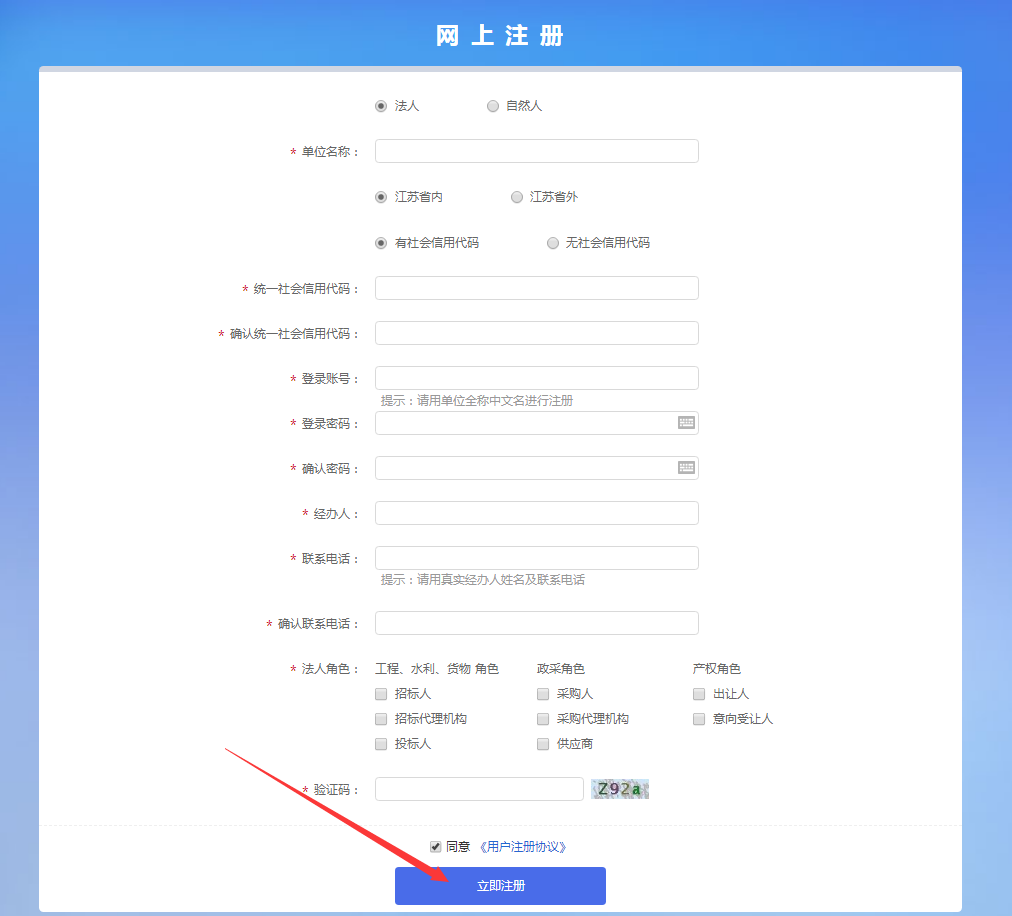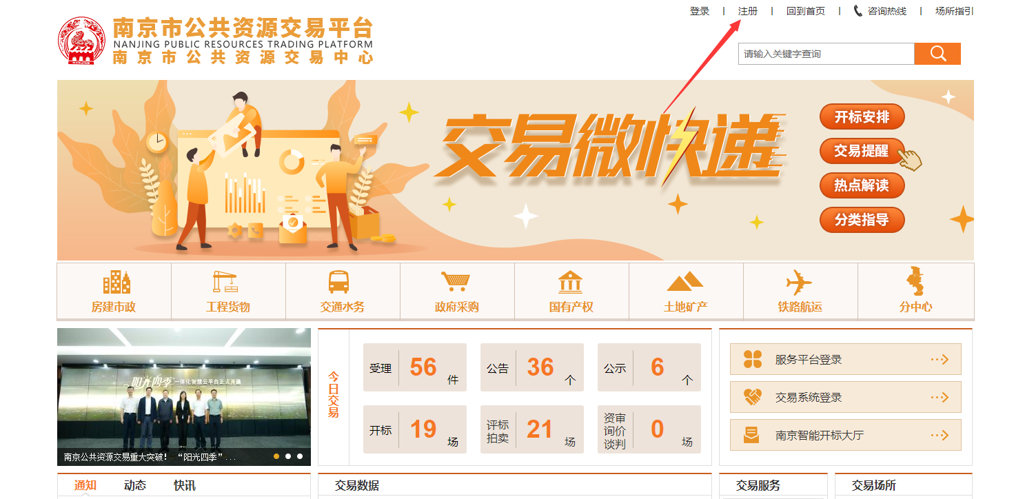 登录南京市公共资源交易平台,点击右上角注册按钮,进入江苏省公共资源服务平台(南京市)注册页面,完善相关信息后点击立即注册,即可注册成功。
