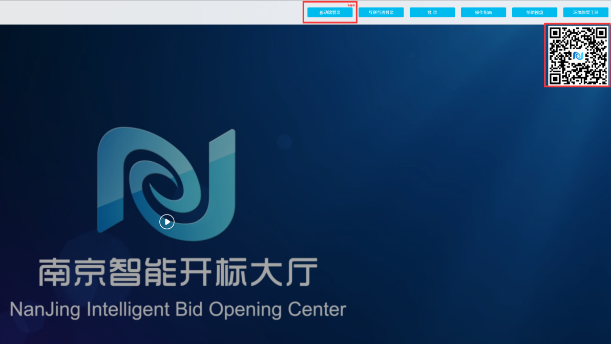 南京智能开标大厅PC端首页也可查看二维码。(点击图标“移动端登录”,页面右上方会显示出该二维码)
