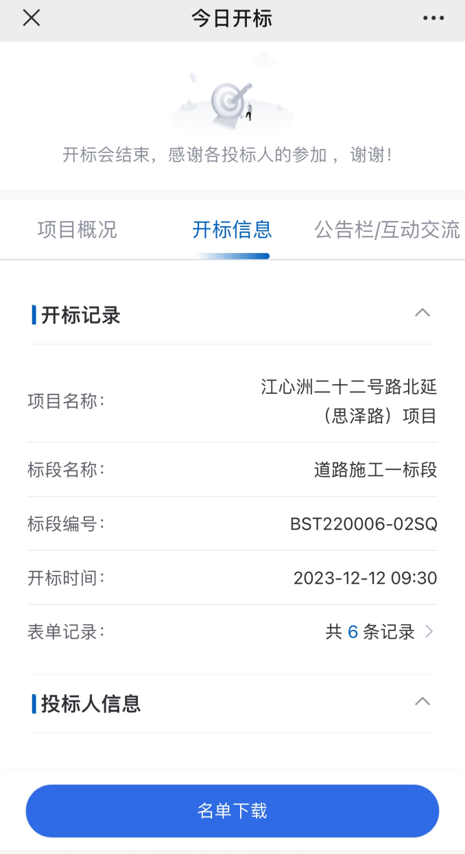 移动端覆盖当天南京市区两级交易中心的电子标、非电子标项目,开标数据与电脑端同步接入、同源发布,数据要素覆盖项目概况、投标单位、解密状态、互动交流、开标记录等。