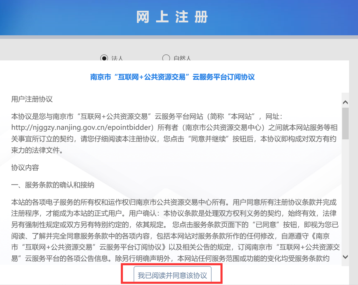 1.进入南京市公共资源交易中心网站,点击“注册”,浏览南京市“互联网+公共资源交易”云服务平台订阅协议,点击“我已阅读并同意该协议”。