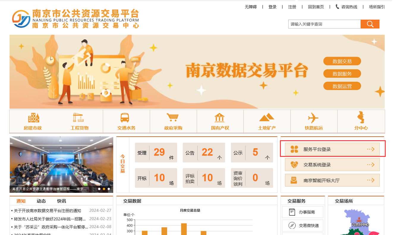 1.进入南京市公共资源交易中心网站,点击“服务平台登录”。
