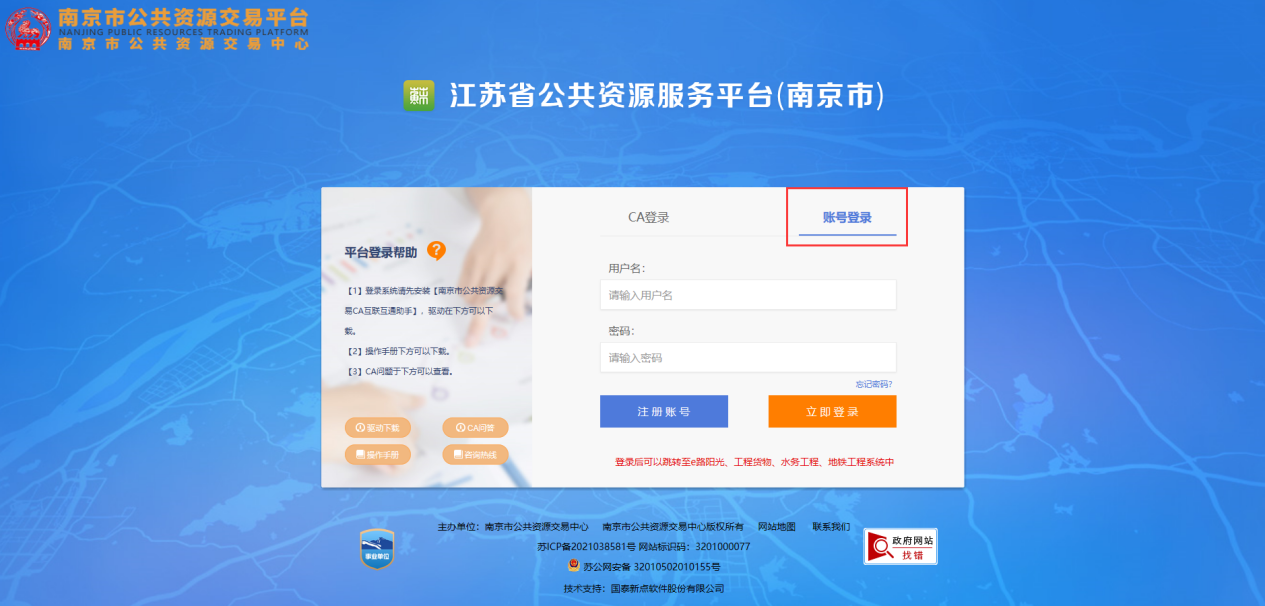 2.使用账号密码登录“江苏省公共资源服务平台(南京市)”。