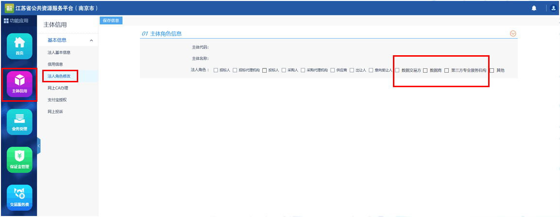 3.选择“主体信用”模块,进入“基本信息—法人角色修改”栏目,根据实际参加数据交易的角色进行选择。