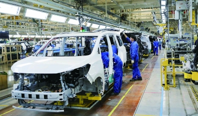 图为位于江宁高新区的上汽大通南京分公司车间内,工人在组装汽车。