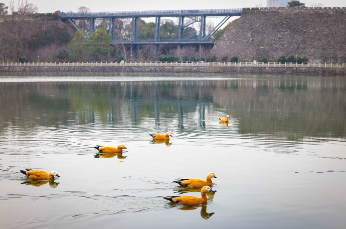 近日,南京前湖春意渐浓,一群赤麻鸭在水面悠然游弋,橙黄羽色与明城墙倒影相映成趣,构成一幅灵动的生态画卷。“春江水暖鸭先知”,这群可爱的生灵成为南京早春的一道动人风景,尽显南京生态之美。