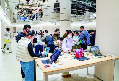 2月24日,新街口商圈一家品牌数码3C旗舰店内,不少消费者咨询选购国产智能手机、笔记本电脑、智能手环等产品。近期,南京多家数码门店借国家补贴推出优惠活动,市场持续升温。