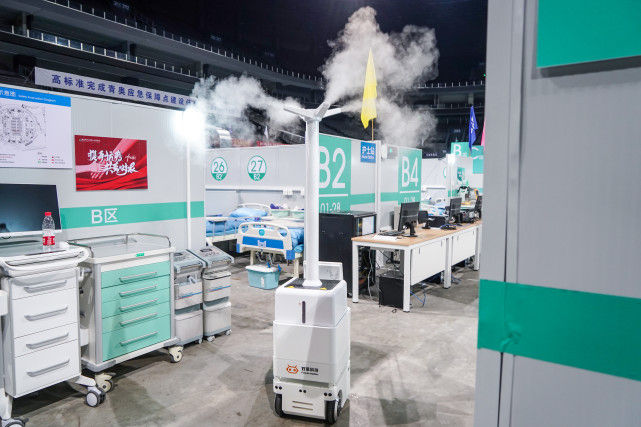 在南京青奥体育公园体育馆内的方舱医院,智能消毒机器人在进行消毒作业测试(4月11日摄)