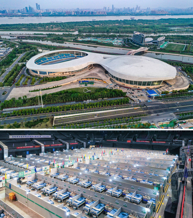 上图为南京青奥体育公园外景,下图为南京青奥体育公园体育馆内的方舱医院(4月11日摄,无人机照片)