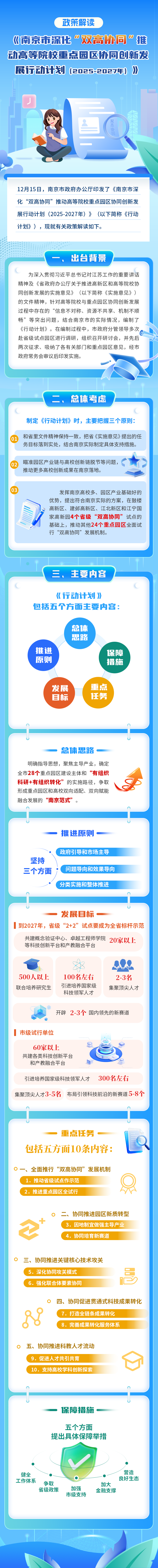 相关文件:市政府办公厅关于印发《南京市深化“双高协同”推动高等院校重点园区协同创新发展行动计划(2025—2027年)》的通知