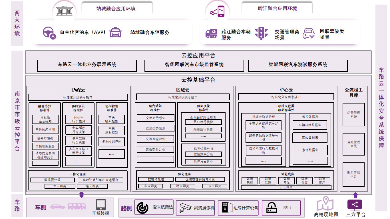 南京市将依据“车路云一体化”推荐标准,面向规模化与商业化应用,整合“车-路-云-网-图”,重点建设“分层解耦、跨域共用、分级共享”的云控基础平台。