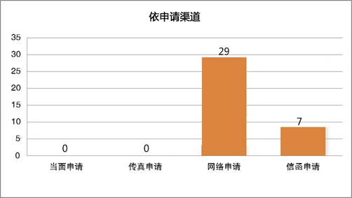 1.依申请渠道畅通。2015年全区共收到政府信息公开申请36件,较上一年度有所上升但总体平稳,申请内容主要涉及土地征用、房屋拆迁、规划建设等方面。其中,当面申请0件,传真申请0件,网络申请29件,信函申请7件。我区向公民、法人和其他组织提供政府信息暂未收费。
