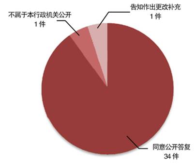 2.依法按时答复。所有申请均已按时答复,其中属于已主动公开范围0件,同意公开答复34件,不属于本行政机关公开1件,告知作出更改补充1件。