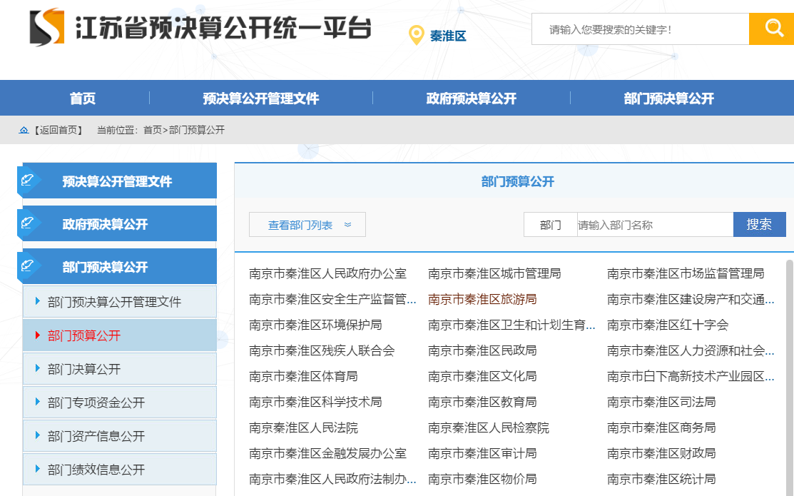 财政预决算信息及时公开。按照《江苏省财政厅部门预决算信息公开管理暂行办法》(苏财办发[2017]15号)文件要求,秦淮区在江苏省统一平台上及时公开本级政府预算、调整预决算,同时还公开了重大财税制度文件及政府部门专项资金管理清单、行政事业性收费项目目录清单、政府性基金项目目录清单等信息120条。
