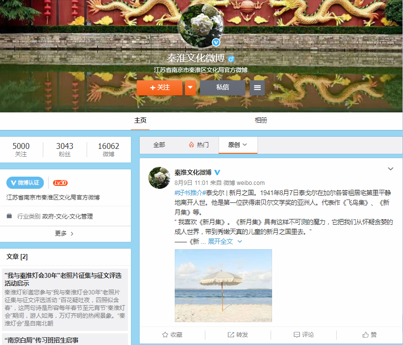 通过新媒体的广泛运用,使得秦淮的网络形象得到进一步彰显,美誉度有所提高,涉及民生的重大政策、举措得到了很好的宣传。秦淮发布微博全年发布各类信息共计6433条,其中,政务类信息4071余条。秦淮发布微信发布1225篇文章,内容涉及教育、交通、文化、旅游、征地拆迁等。