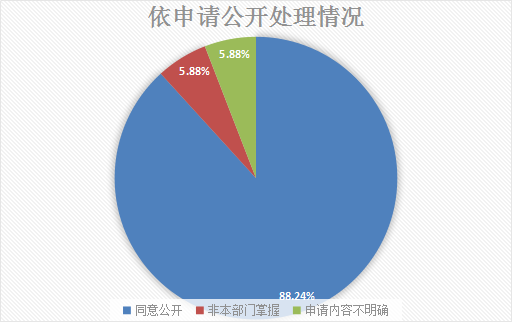 在全部34件申请中,经核查有效申请32件。其中“同意公开”的为30件,占总数的88.24%;“非本部门掌握”的为2件,占5.88%;“申请内容不明确”2件,占5.88%。