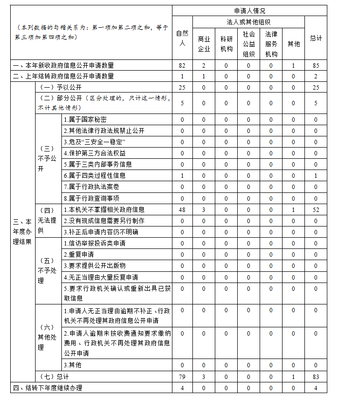 (二)依法依规,做好依申请公开。保障公民、法人和其他组织依法获取政府信息,全年收政府信息公开申请85件,上年结转政府信息公开申请2件。已依法办结83件,结转下年度继续办理4件。其中,属于同意公开的25件、同意部分公开的5件、不同意公开的1件(属于四类过程性信息)、无法提供(本机关不掌握)的52件。
