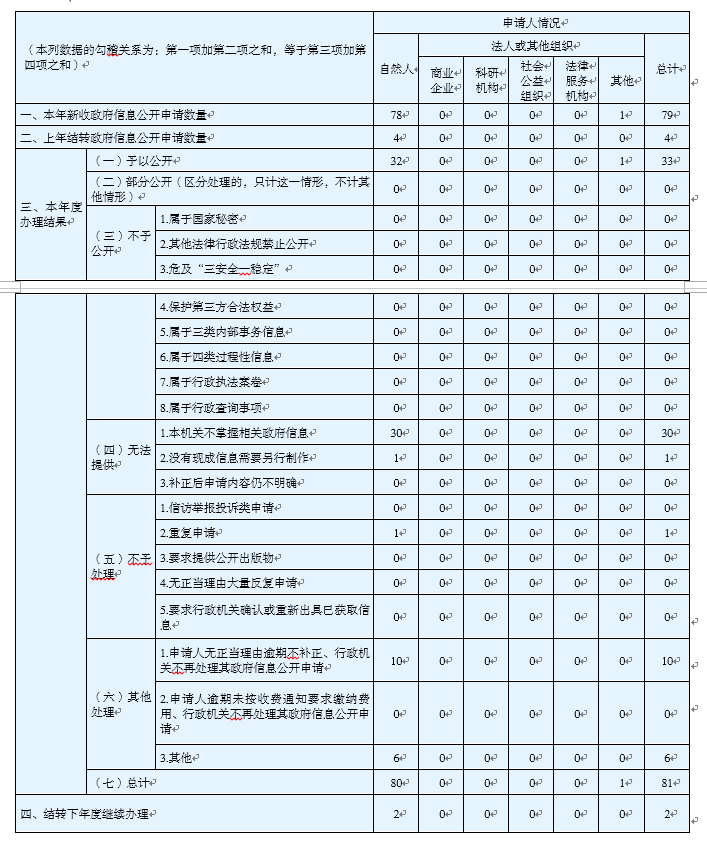 (二)依法依规,做好依申请公开。保障公民、法人和其他组织依法获取政府信息,全年收到政府信息公开申请79件,上年结转政府信息公开申请4件。已依法办结81件,结转下年度继续办理2件。其中,属于同意公开的33件,因本机关不掌握、没有现成信息需要另行制作而无法提供的31件,重复申请不予处理的1件,申请人无正当理由逾期不补正不再处理的10件,申请人撤回申请的6件。