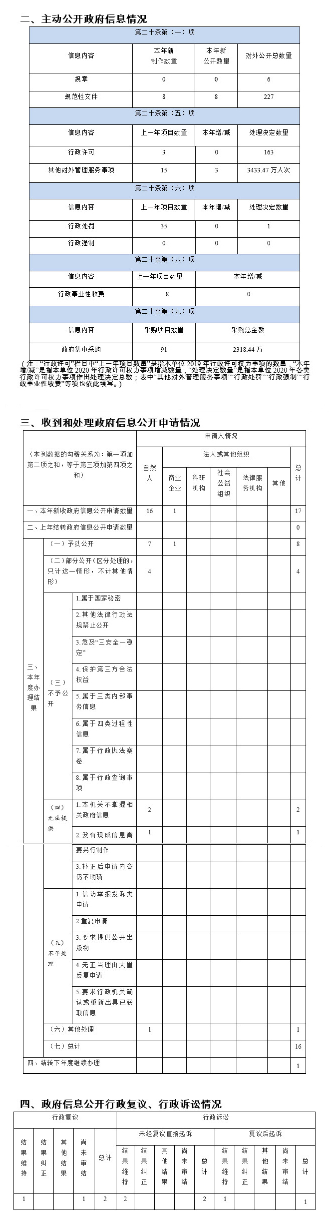 四是严谨规范做好依申请公开及复议、诉讼工作。准确执行新修订的《政府信息公开条例》,认真落实上级有关政府信息公开答复规范的要求,针对性引用具体条款,按照规定时限、规定程序、规定格式及申请人要求内答复申请人。2020年度,共收到依申请公开17件,其中自然人申请16件,商业企业申请1件,予以公开9件,部分公开4件,不予公开0件,无法提供3件,不予处理1件;依申请公开被行政复议案件数为2件,其中维持1件,尚未审结1件,依申请公开行政诉讼案件数为3件,其中未经复议直接起诉2件,已结案2件,结果维持1件,复议后起诉1件,结果维持1件。