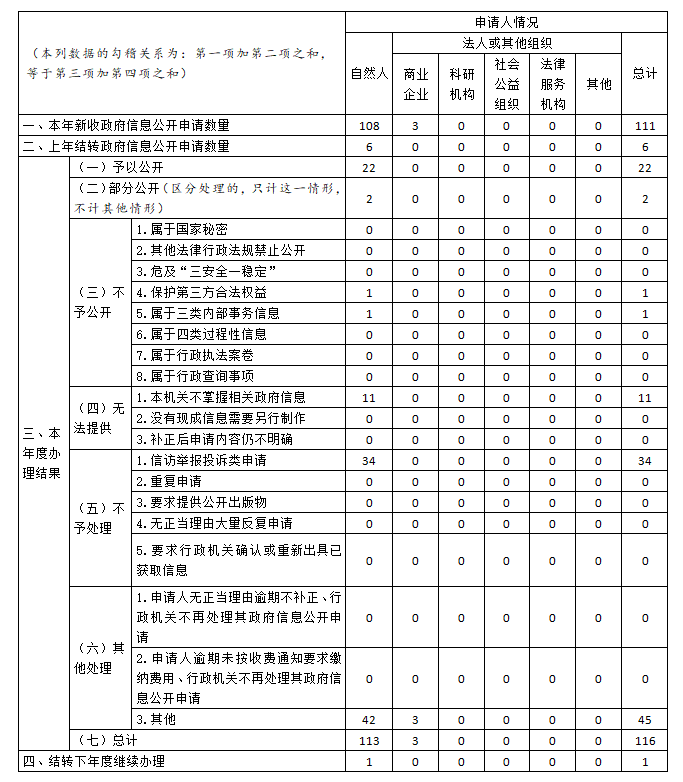 (二)依申请公开。及时办理答复依申请公开,确保答复文本办理的及时性、规范性。做好政府信息公开行政复议、诉讼案件的办理,确保办理的合法性。2024年,共收到政府信息依申请公开办件111件,其中自然人108件申请,商业企业申请3件。认真做好政府信息公开行政复议、诉讼案件的办理工作,2024年政府信息公开案件行政复议共有4件,结果维持4件;未经复议直接起诉4件,其他结果4件;复议后起诉有4件,结果维持4件。上述政府信息公开申请、复议案件已全部办结、结案,并根据相关规定、判决、决定落实完毕。