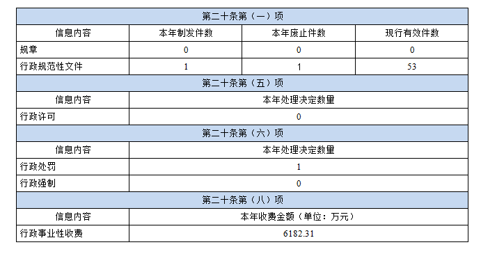 (一)主动公开。一是及时主动公开各类法定基础内容。按照《江苏省行政规范性文件管理规定》要求,对1件新制发的行政规范性文件公开征求意见,充分保障社会公众的参与权;严格按照规定时限向市司法局报请备案,将行政规范性文件在江苏省法规规章规范性文件数据库和局门户网站上公开;按照“谁制定、谁清理”的原则,对不适应经济社会发展需要、不符合实际的行政规范性文件,定期进行清理。认真执行法律法规规章、“三定”规定等相关要求,依托省人社一体化信息平台和省政务服务事项管理系统,将依法设定的行政权力事项全部纳入标准化清单管理,其中行政许可3项、行政给付3项、行政确认5项、行政奖励1项、行政处罚38项、其他行政权力16项,并通过局门户网站、江苏省政务服务网等渠道主动公开,以便企业群众查阅、使用。二是做好重点领域信息公开。对财政信息公开内容进行分类,部门预决算说明、表格、“三公”经费预决算情况以及部门整体绩效、项目绩效目标和绩效评价结果已在“江苏省预决算公开统一平台”和“局门户网站”双公开。收费项目在局门户网站公开。