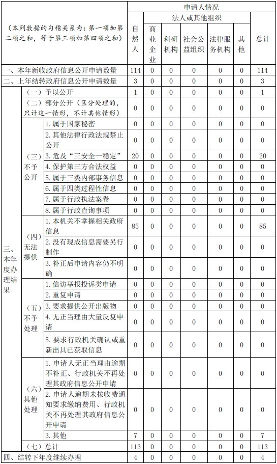 (二)规范办理依申请公开。2024年,我办新收到政府信息公开申请114件,均为自然人申请办件,其中4件为跨年度答复,上年度结转政府信息公开申请3件,全部按时完成答复,且未收取任何费用。具体答复情况以及涉及行政复议、行政诉讼的情况详见本报告第三、第四部分。