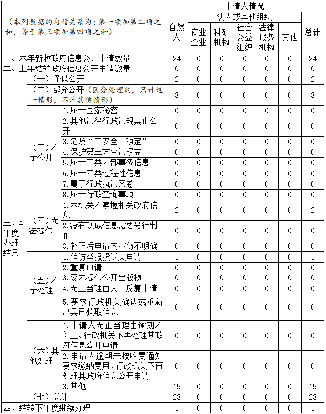 (二)依申请公开情况。2024年我局共收到政府信息公开申请24件,其中自然人申请24件,均已按期处理,且未收取任何费用。具体答复情况以及涉及行政复议、行政诉讼的情况详见本报告第四、第五部分。