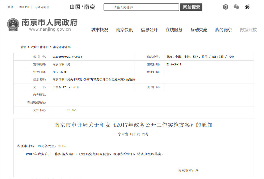 主动公开南京市审计局2017年政务公开工作实施方案