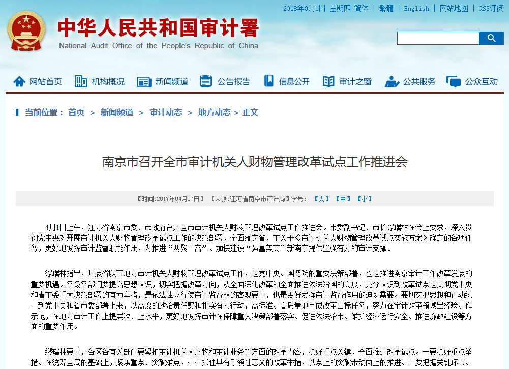 审计署网站报道南京市召开全市审计机关人财物管理改革试点工作推进会