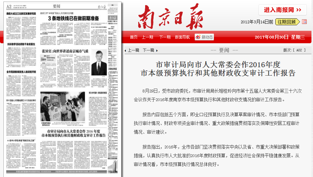 《南京日报》报道南京市市审计局局长姬桂玲向市第十五届人大常委会第三十六次会议