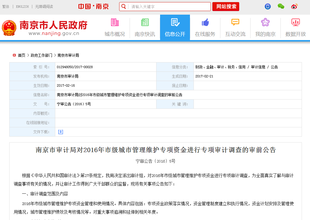 南京市审计局对2016年市级城市管理维护专项资金进行专项审计调查的审前公告