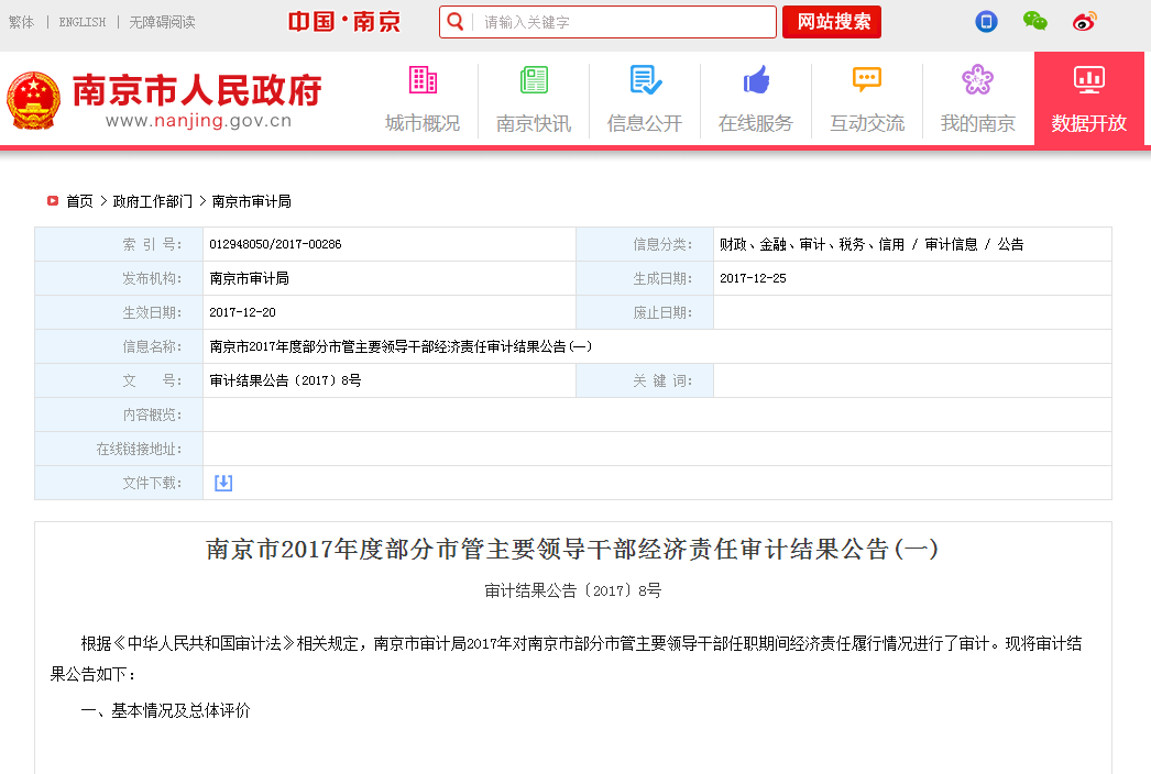 南京市2017年度部分市管主要领导干部经济责任审计结果公告(一)