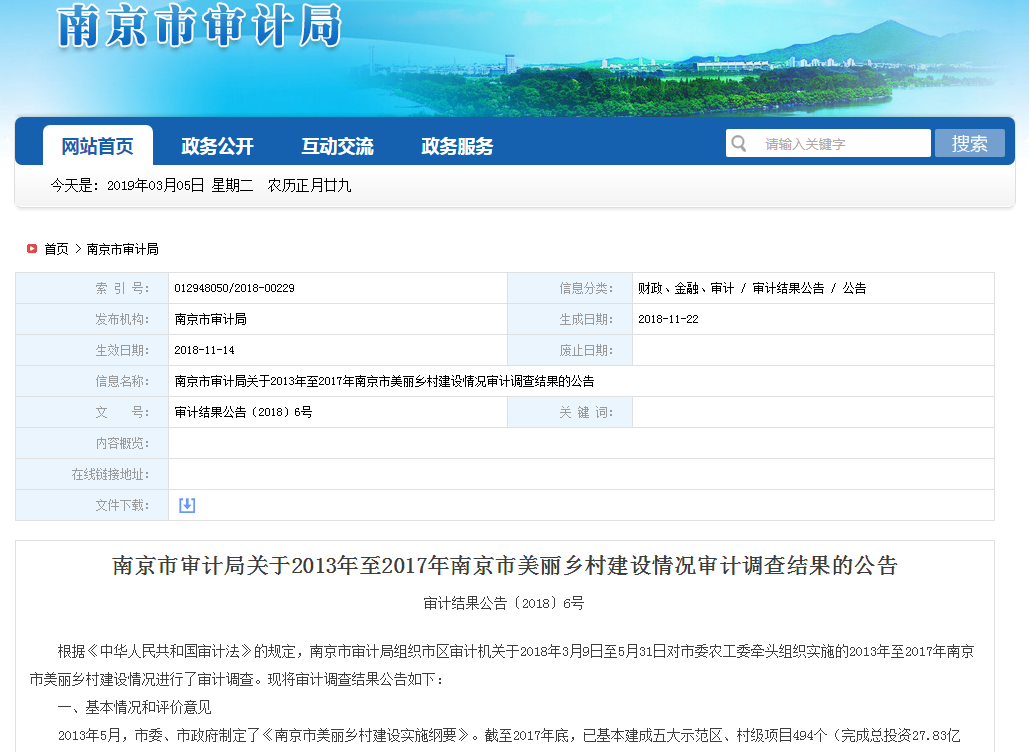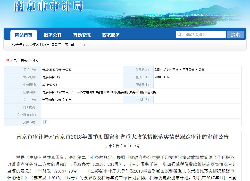 南京市2018年四季度国家和省重大政策措施落实情况跟踪审计的审前公告