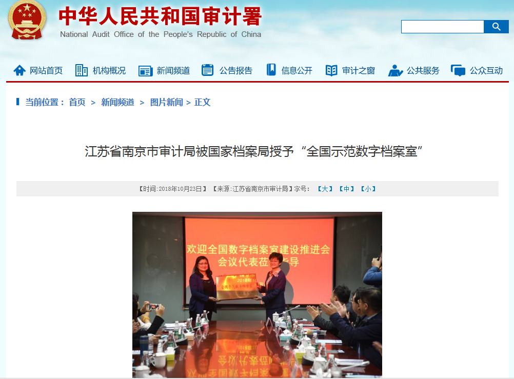 审计署网站报道南京市审计局被国家档案局授予“全国示范数字档案室”