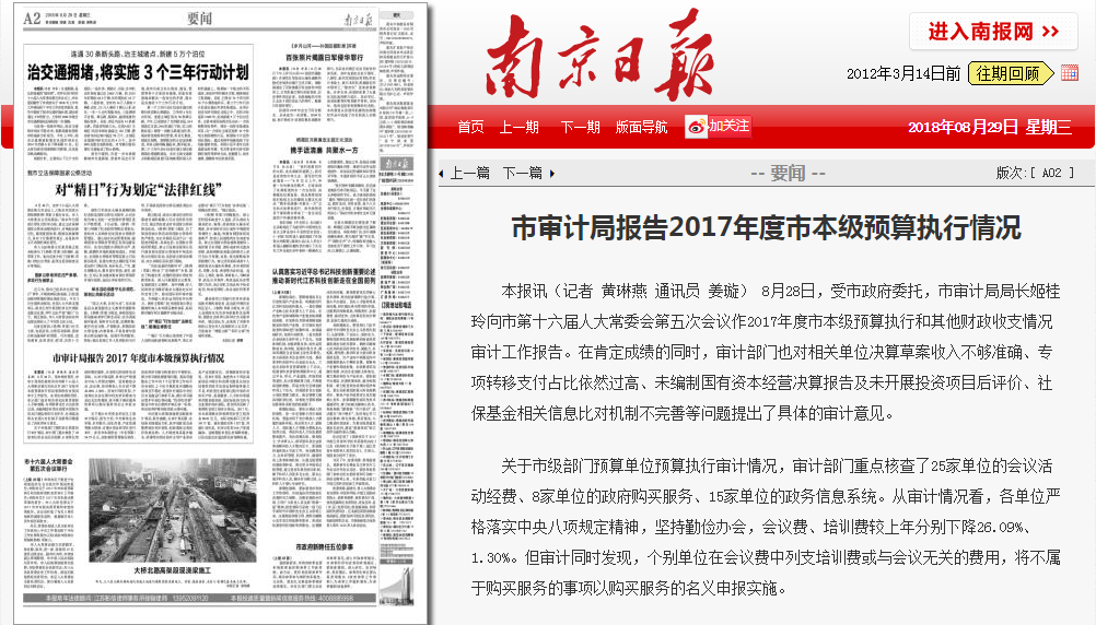 《南京日报》报道南京市市审计局报告2017年度市本级预算执行情况
