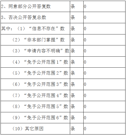 6、“免予公开范围6”数:指对公民、法人和其他组织的申请以属于法律、法规规定免予公开等原因而否决公开的答复数量。